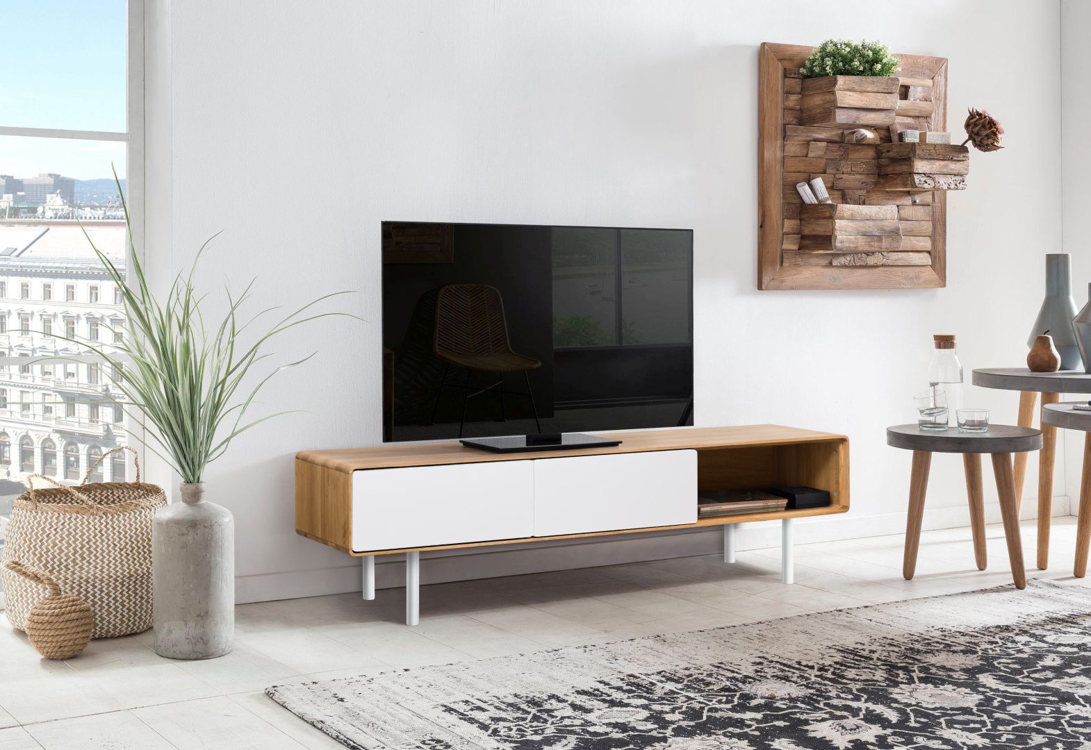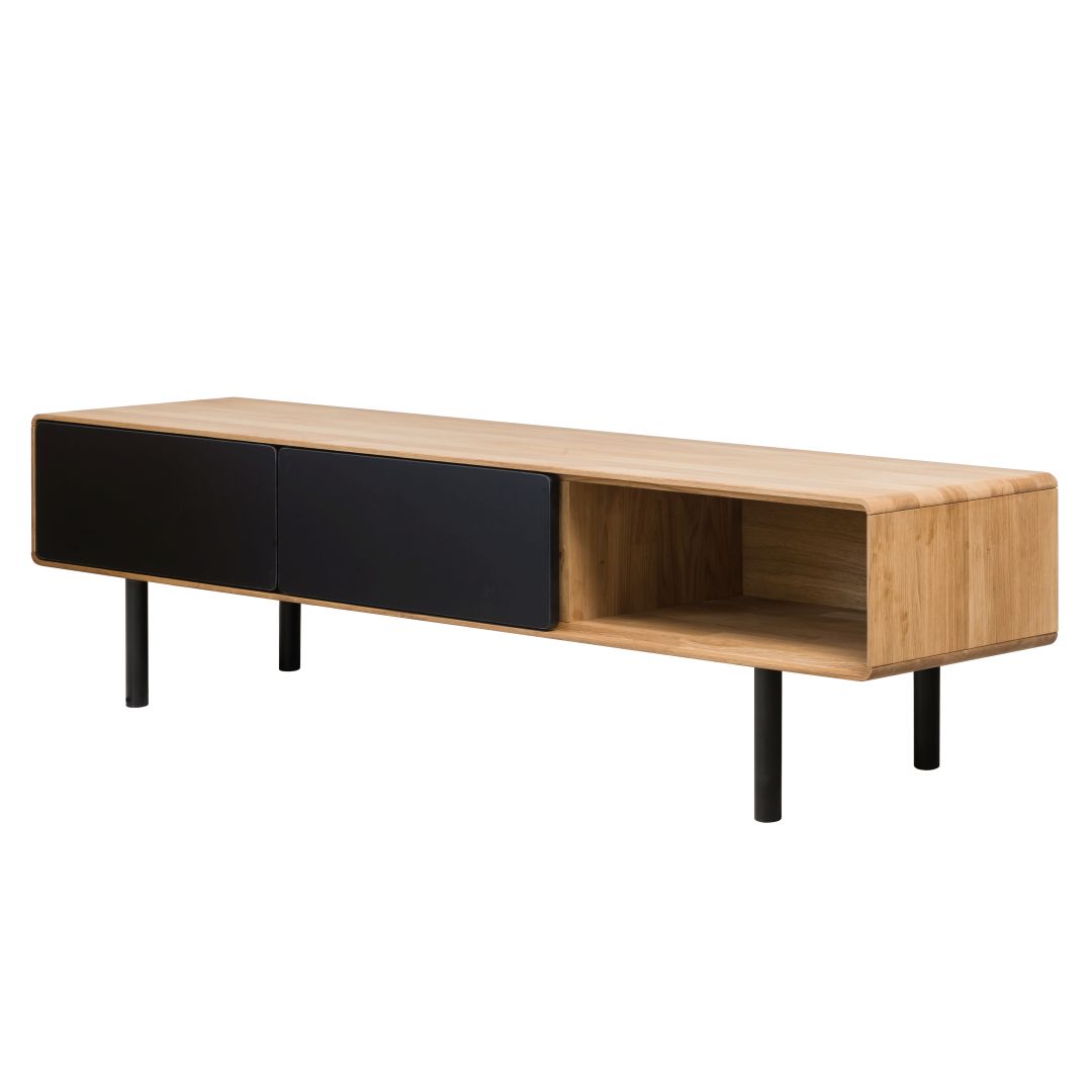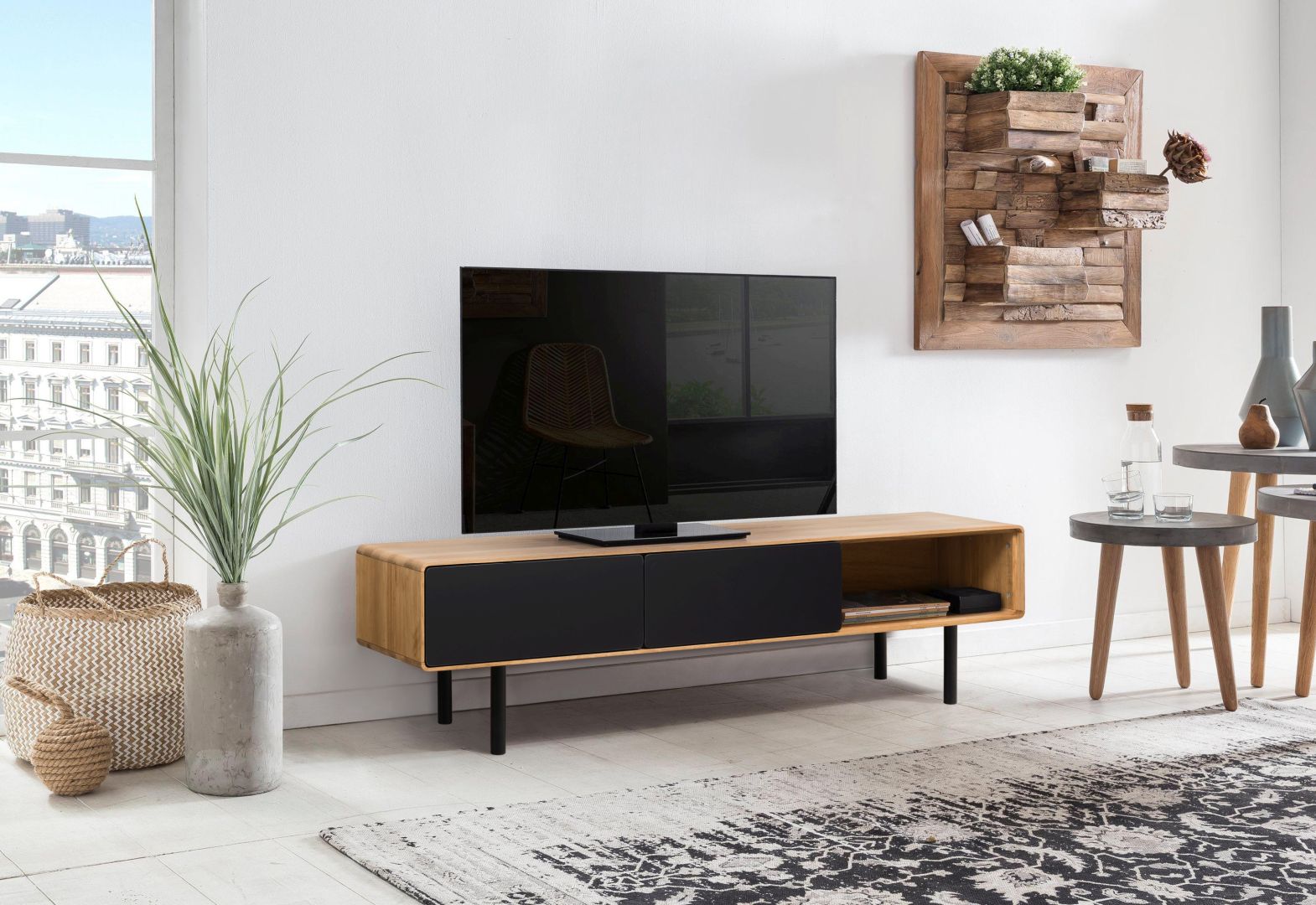 Połączenie litego dębu z nowoczesnym designem, który dopasujesz do siebie. Ten model oferuje unikalny, asymetryczny układ z dwiema szufladami i otwartą wnęką, zapewniając idealny balans między przechowywaniem a ekspozycją sprzętu RTV.