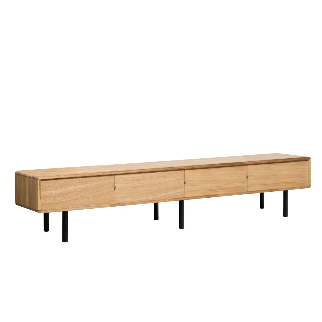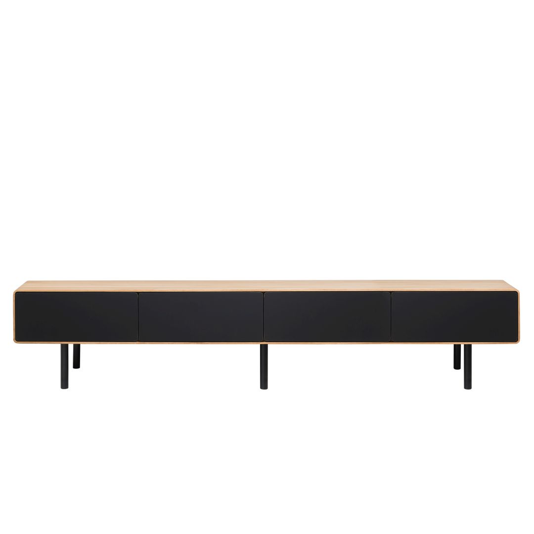 Nowoczesna komoda RTV z korpusem z jasnego dębu, wykończonego naturalnym woskiem. Dwie szuflady i dwie szafki otwierane na dotyk (push-on), z pełnym wysuwem szuflad. Fronty szuflad i metalowe nóżki dostępne w eleganckim białym lub czarnym kolorze, do wyboru. Zaokrąglone krawędzie podkreślają unikalny design. Idealna do każdego salonu.