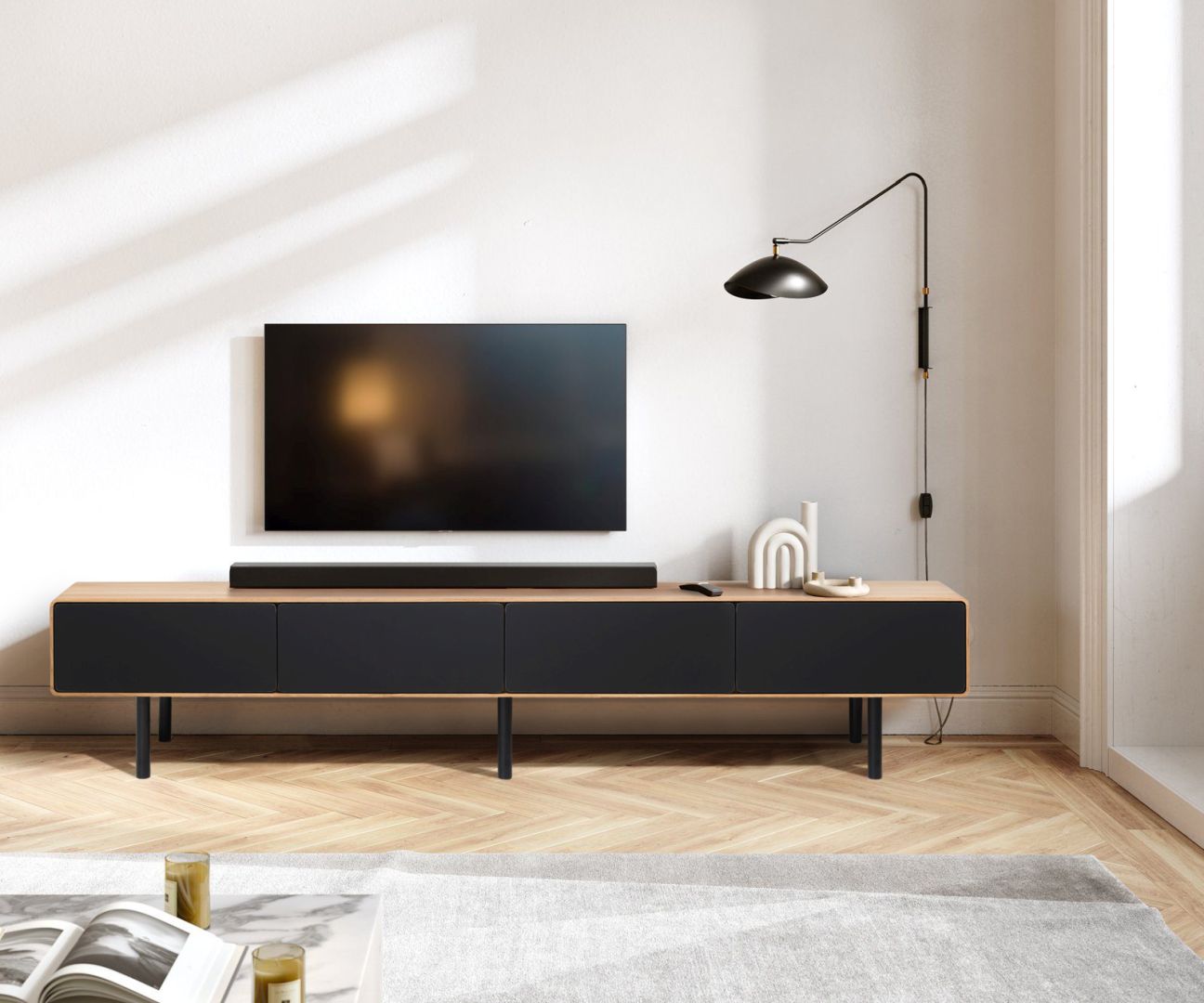 interior aranżacja komoda RTV TV1 B&W 4.0.4 (dąb, wosk)front czarnyinterior aranżacja komoda RTV TV1 B&W 4.0.4 (dąb, wosk)front czarny