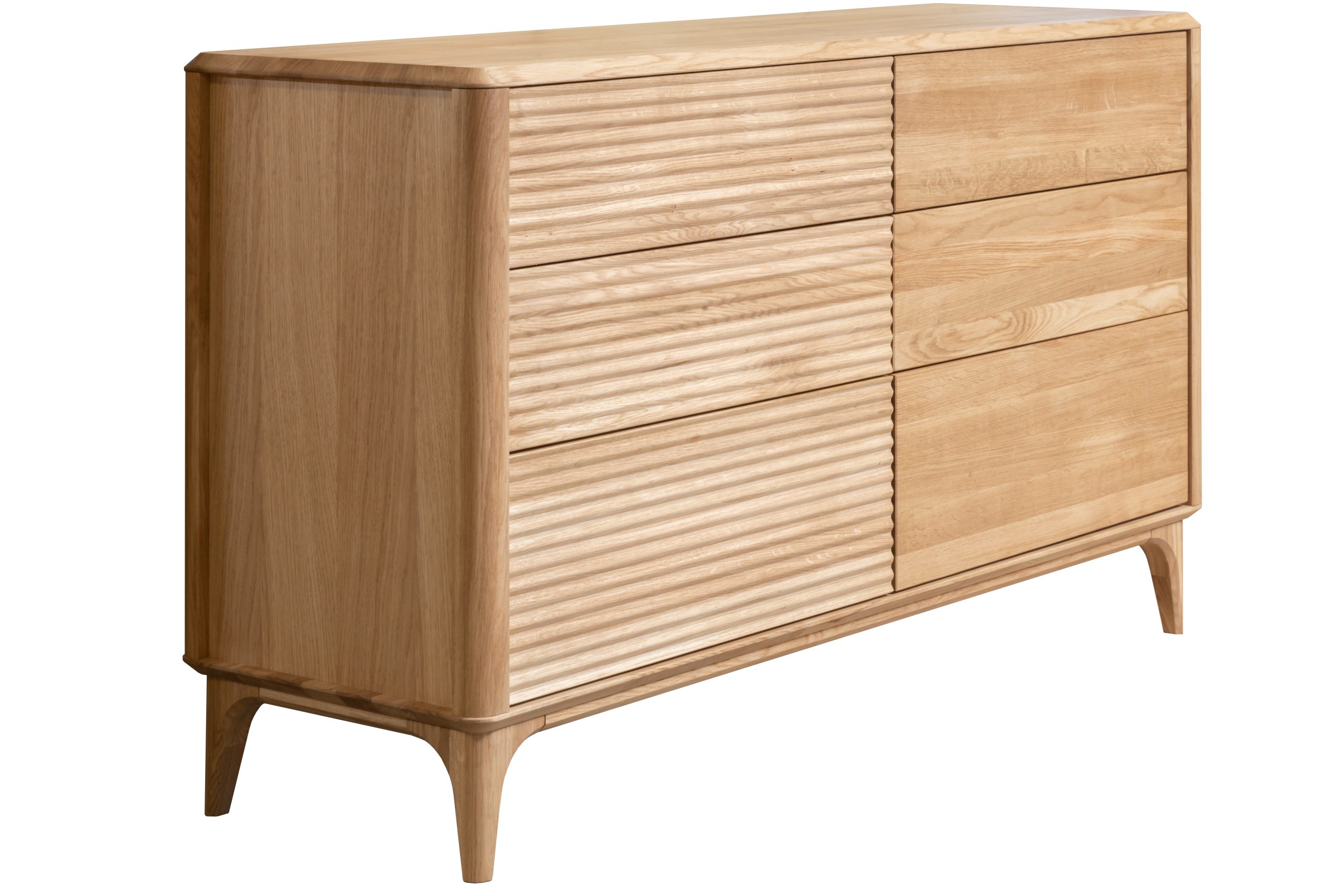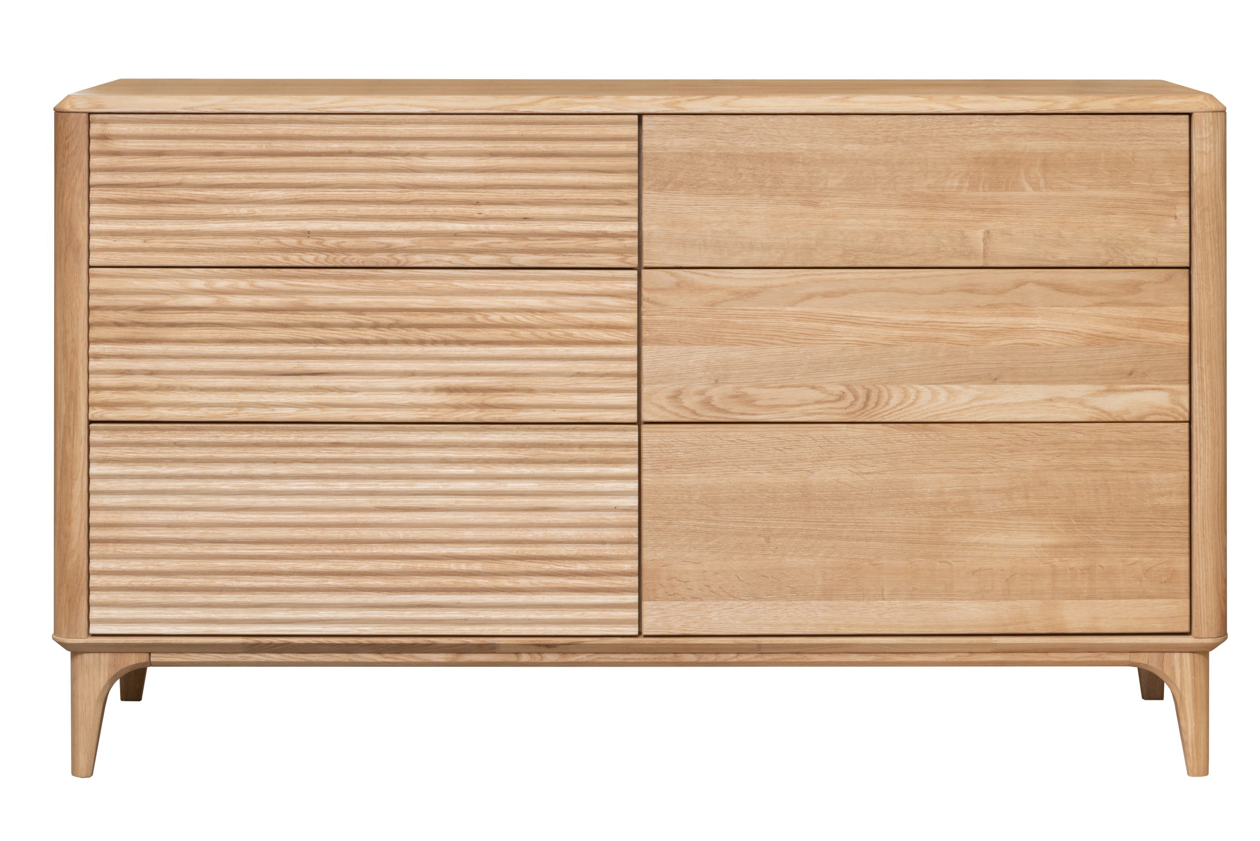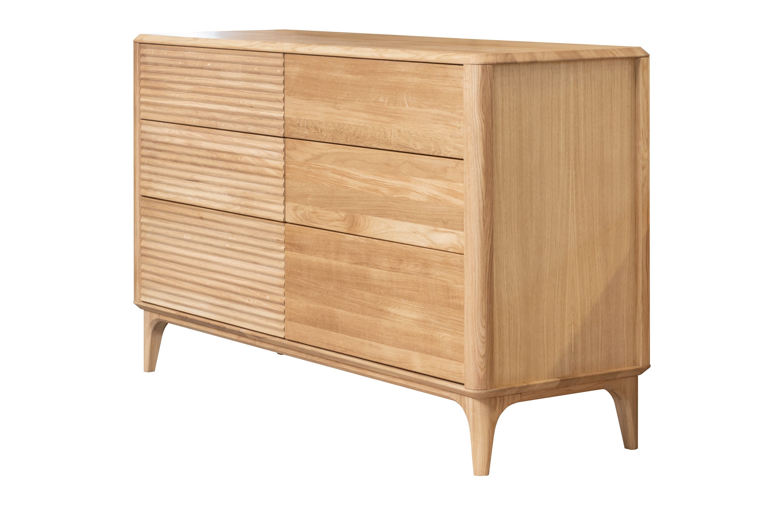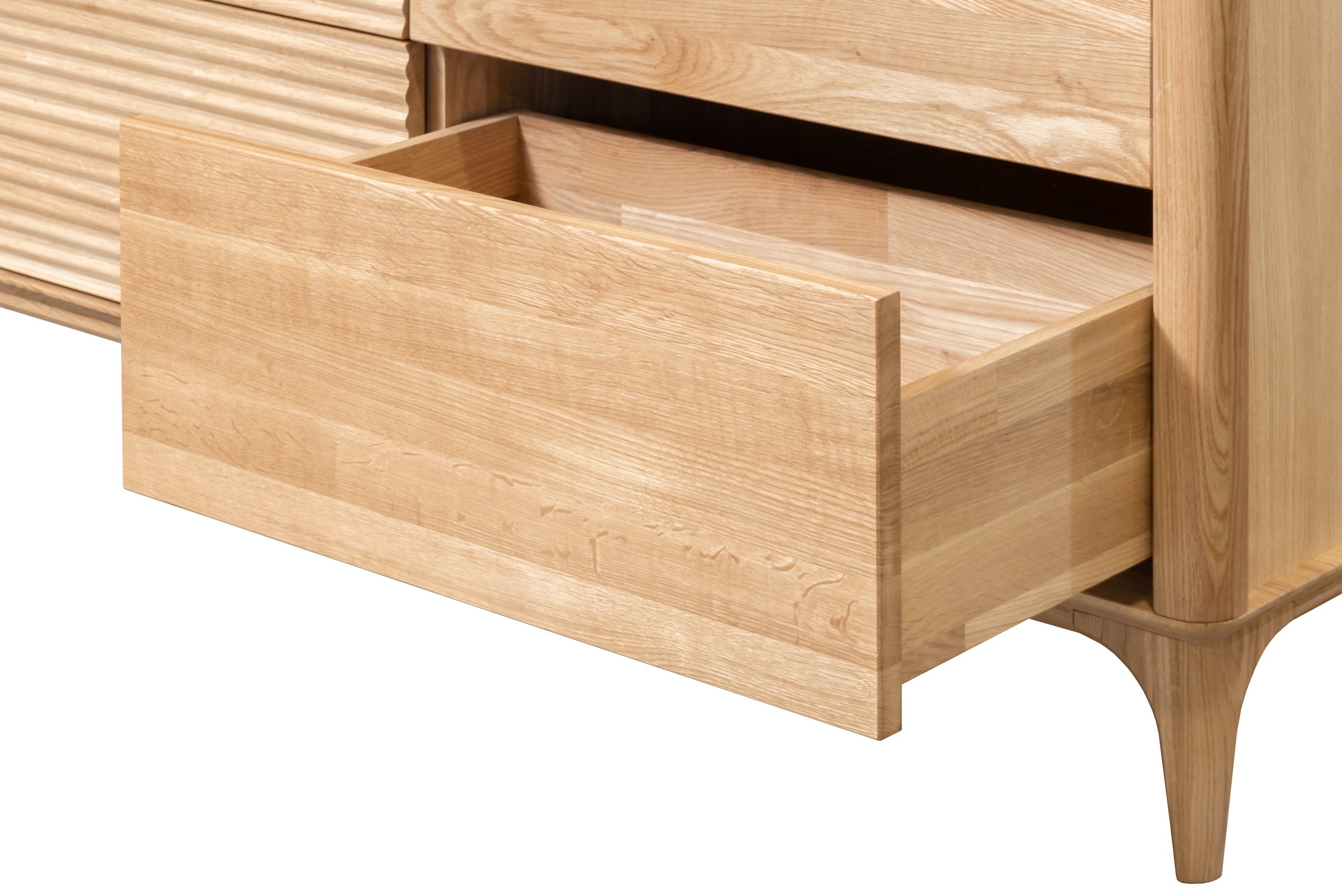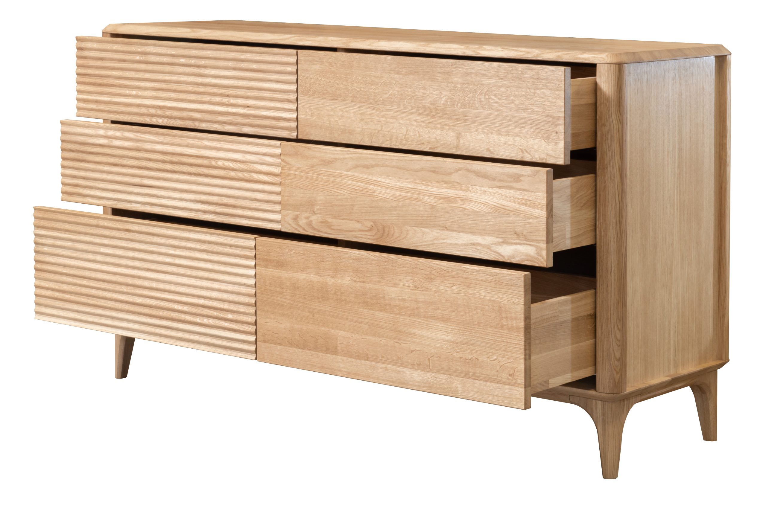 Szeroka komoda z litego drewna dębowego, wyposażona w 6 szuflad. Połowa szuflad ma ryflowane fronty, połowa gładkie. Mebel stoi na smukłych nogach, ma zaokrąglone krawędzie i nowoczesny, naturalny charakter.