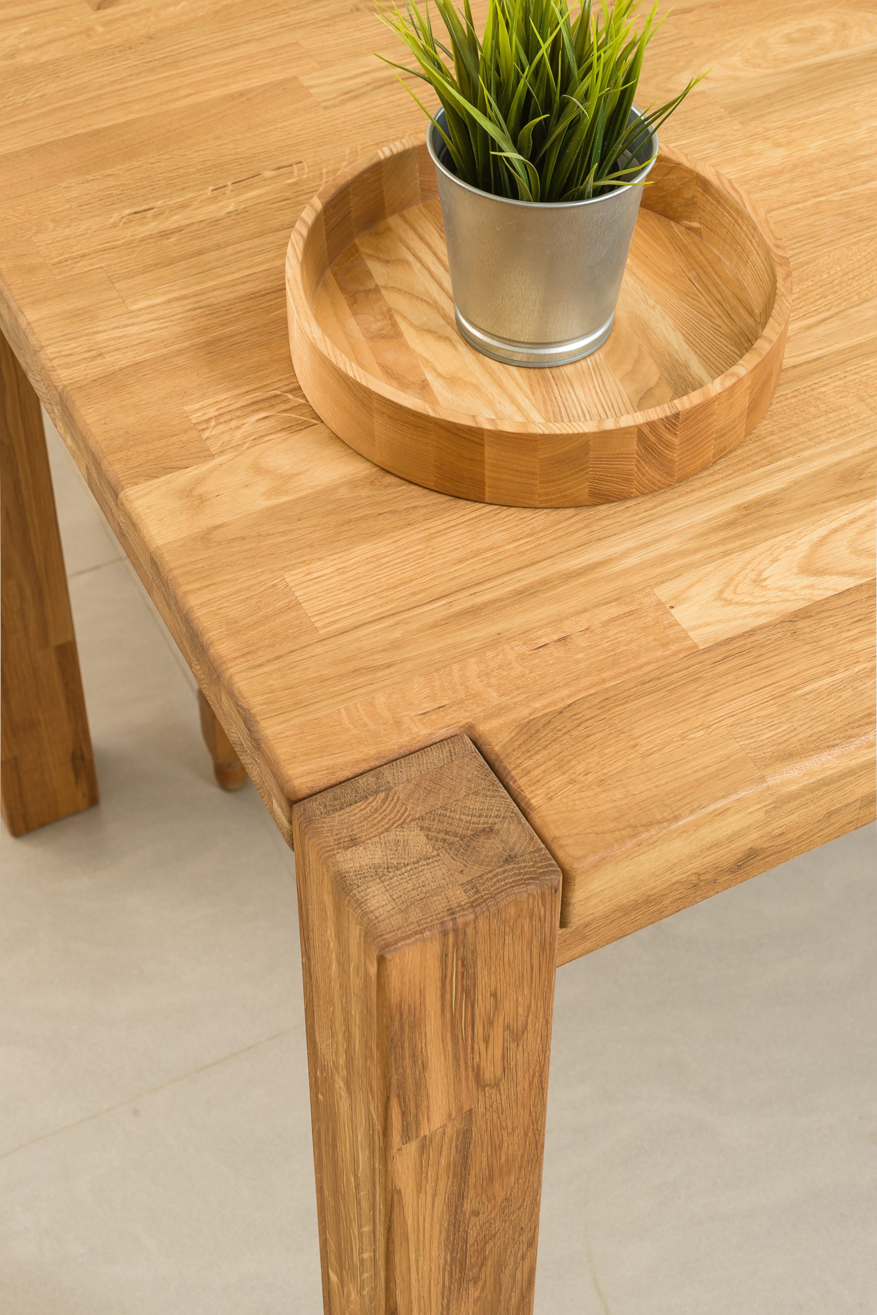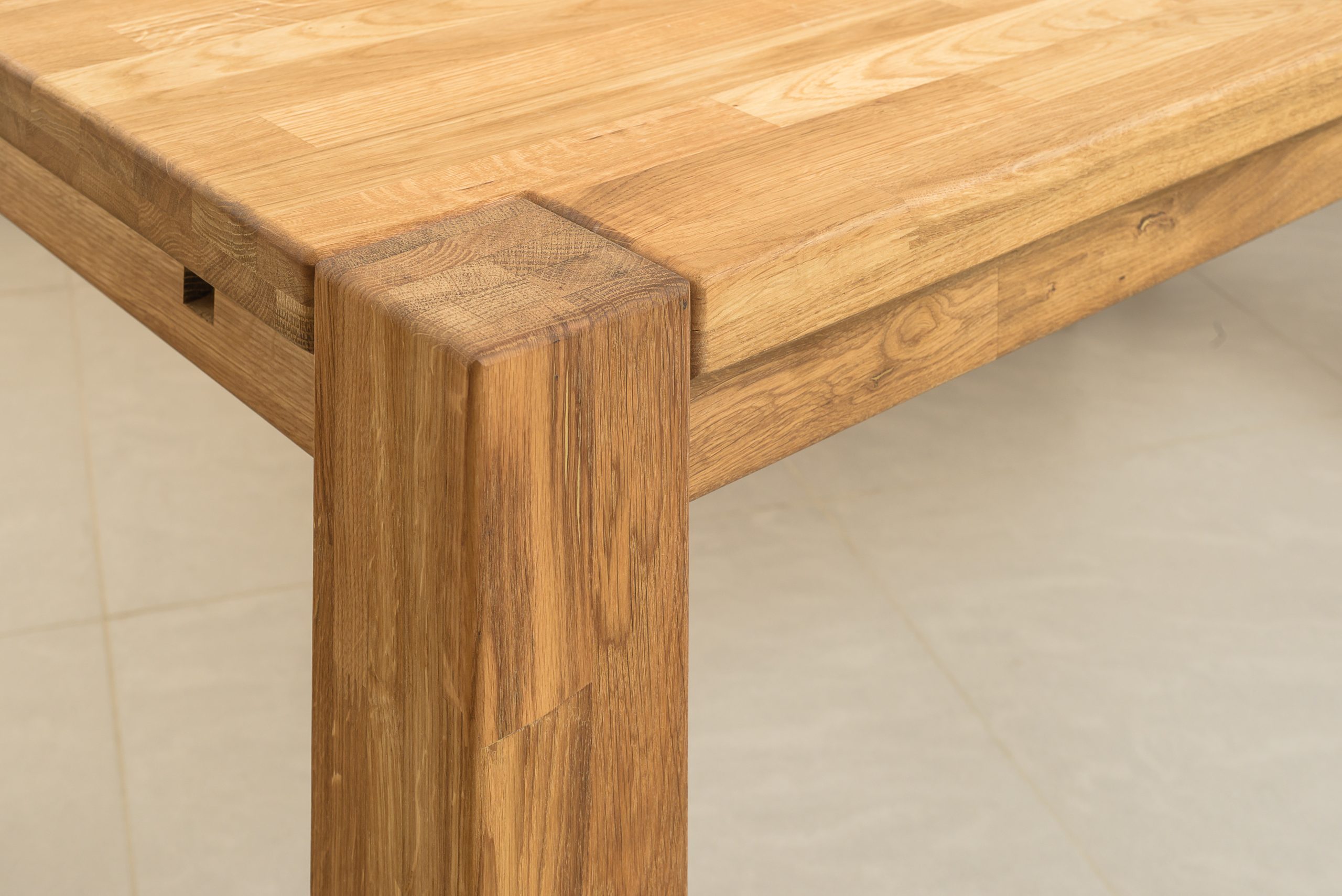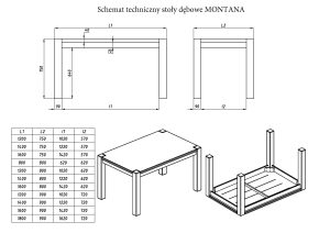 Stół dębowy MONTANA wykonany jest z naturalnego drewna dębowego, płyty z klepki  Mebel wyposażony jest w blat o grubości 2 cm, który wizualnie został pogrubiony do 4 cm, nadając mu masywności i elegancji. Nogi o wymiarach 9×9 cm dodają stabilności, zapewniając solidne podparcie dla całej konstrukcji. Nogi są widoczne w rogach blatu. Stół nie ma możliwości rozłożenia