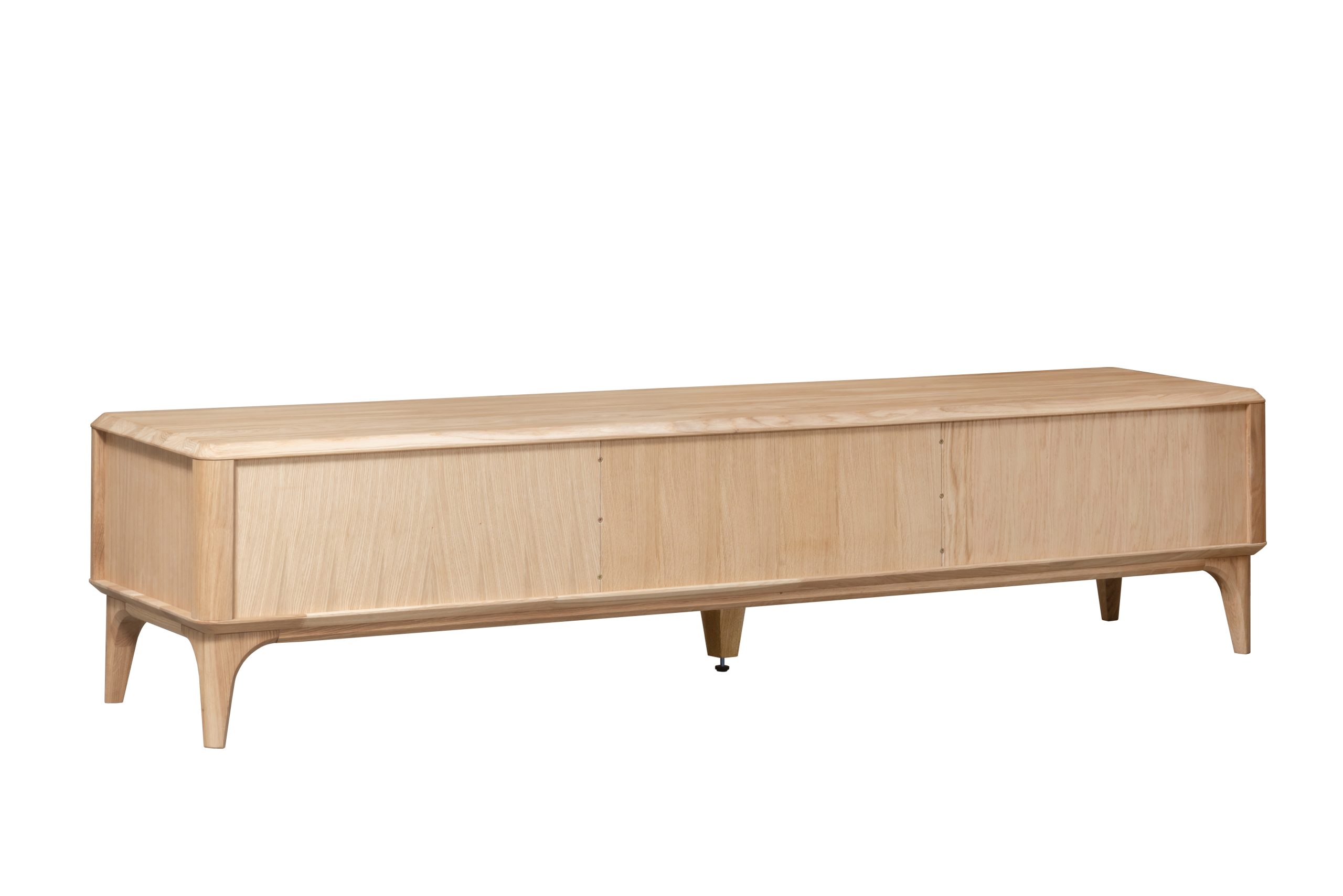 Trzy pojemne szuflady – dwie z dekoracyjnymi, ryflowanymi frontami i jedna gładka w centralnej części – zapewniają praktyczne miejsce do przechowywania sprzętu RTV, kabli, pilotów czy innych niezbędnych akcesoriów. Delikatnie zaokrąglone krawędzie i subtelnie wygięte nogi nadają meblowi lekkości, jednocześnie podkreślając jego wyjątkowy charakter.