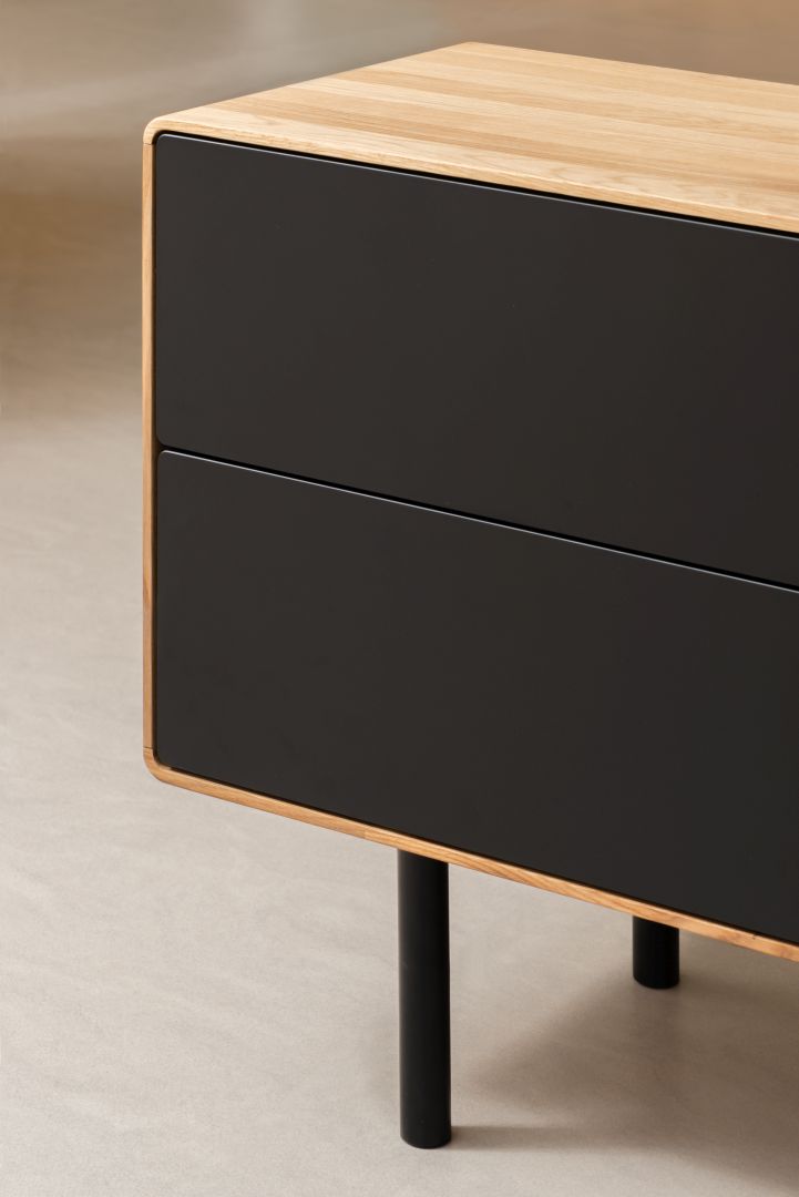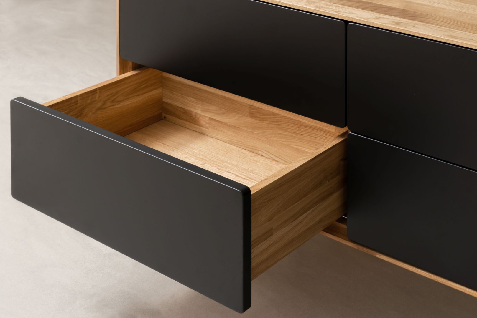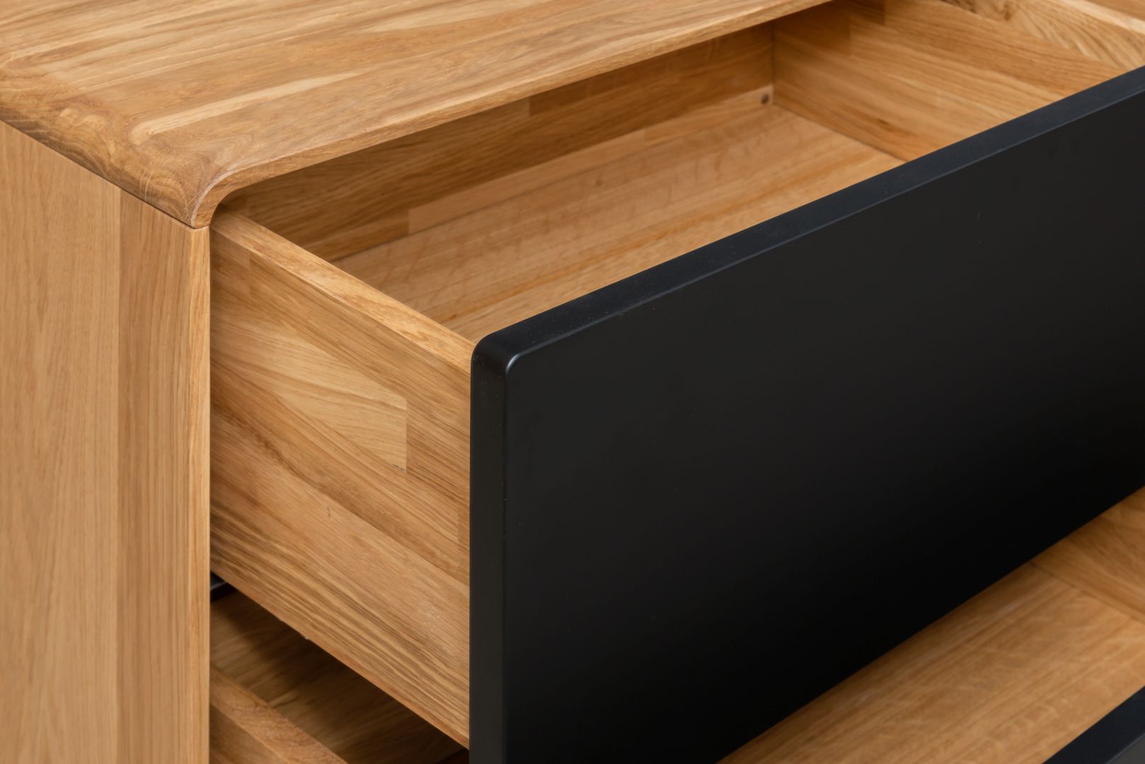 Odkryj idealne połączenie naturalnego piękna litego dębu z nowoczesnym, minimalistycznym wzornictwem. Komoda RTV z kolekcji B&W (Black & White), model TV2 3.0.4, to mebel stworzony dla miłośników prostoty, elegancji i inteligentnych rozwiązań. Jej ponadczasowy design, oparty na kontraście ciepłego drewna i gładkich, matowych frontów w czerni lub bieli, stanie się centralnym punktem Twojego salonu i doskonałą bazą pod telewizor oraz sprzęt multimedialny.
