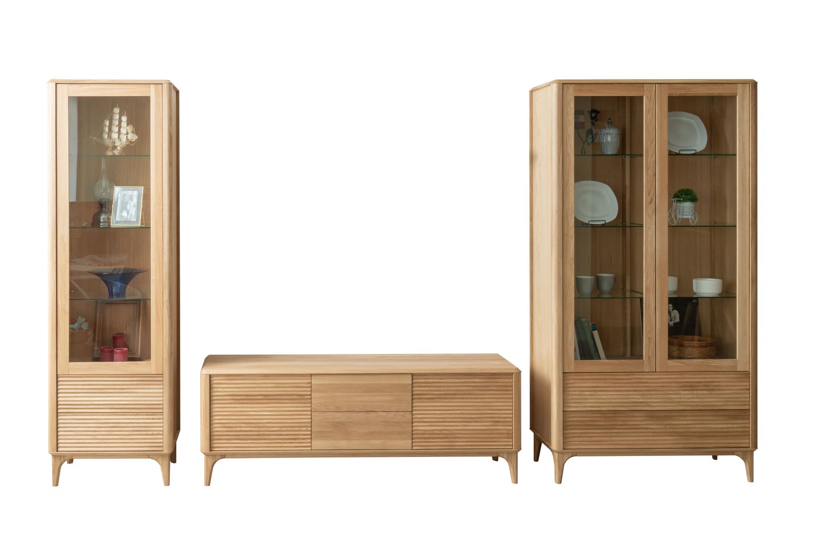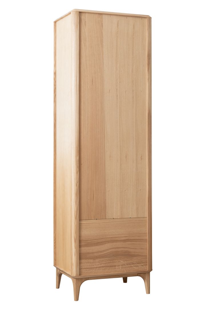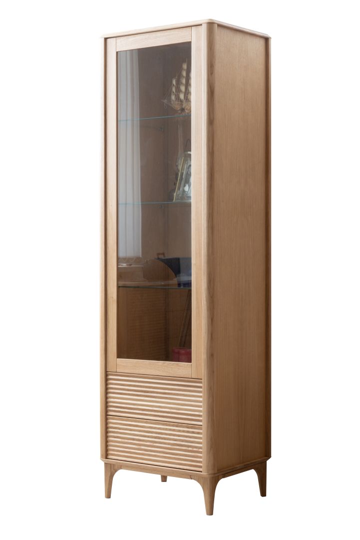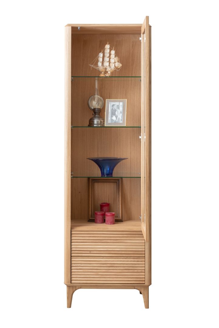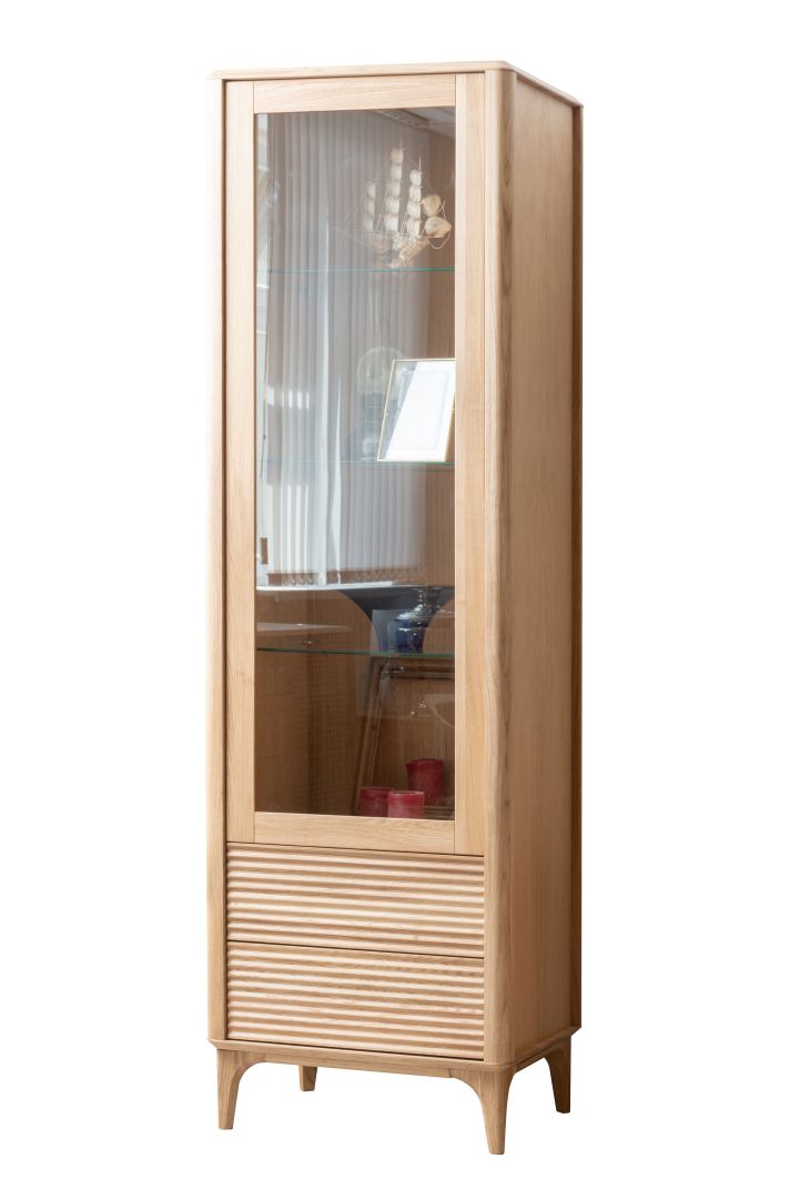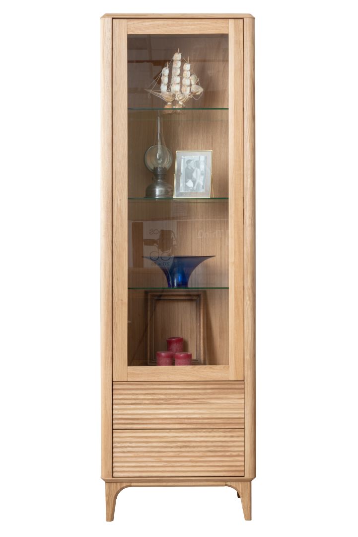Wysoka i wąska witryna z litego drewna dębowego o wysokości 195 cm. Posiada przeszkloną część górną z półkami ekspozycyjnymi oraz dwie dolne szuflady z ryflowanymi frontami. Mebel na smukłych nogach z zaokrąglonymi krawędziami, o nowoczesnym, naturalnym charakterze.